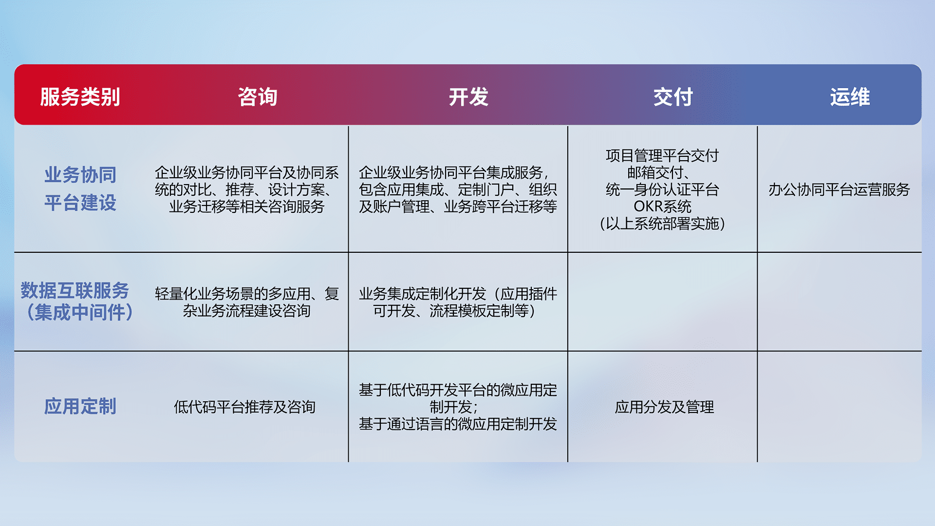 针对钉钉、、、企微、、、、IDaas等平台级产品提供产品的规划、、方案、、交付、、、定制化开发等服务,,,,实现如统一协同办公、、智能客户服务、、混合会议管理、、智能数据查询、、、等业务场景,,实现数字化转型。。。。
